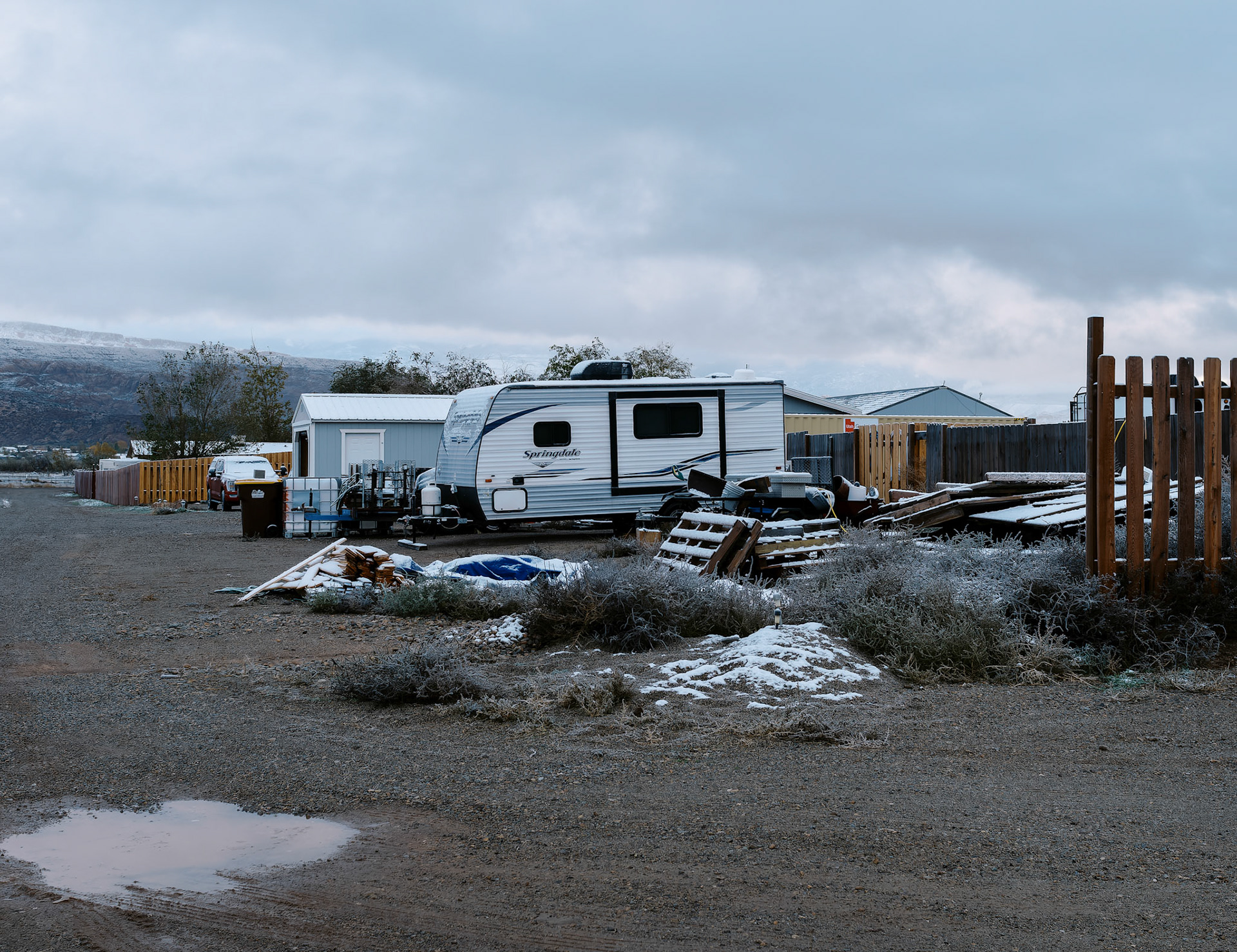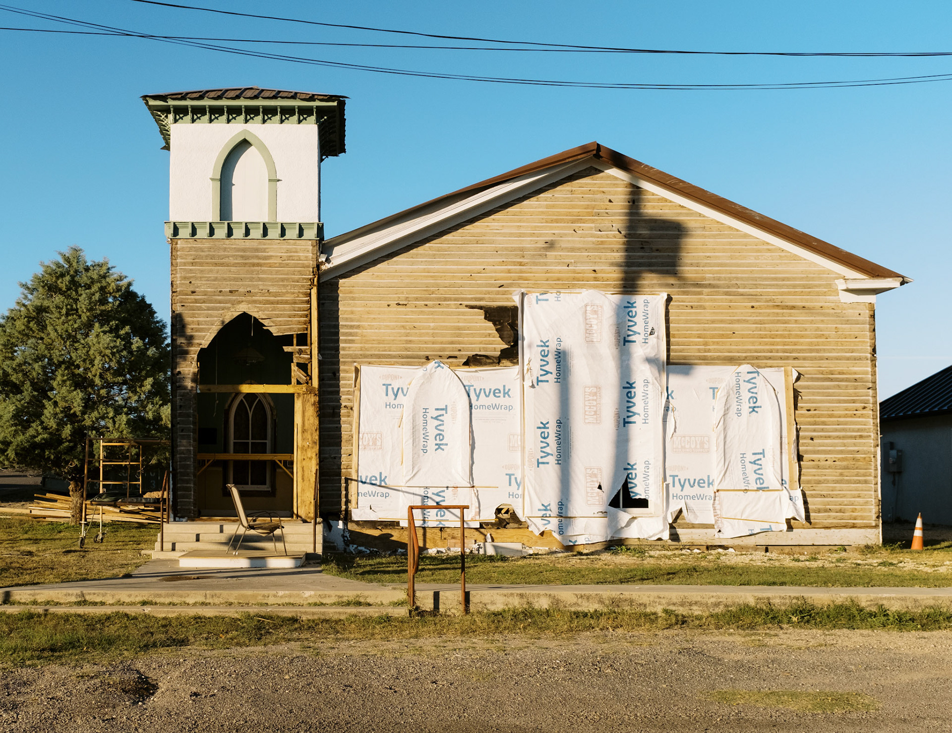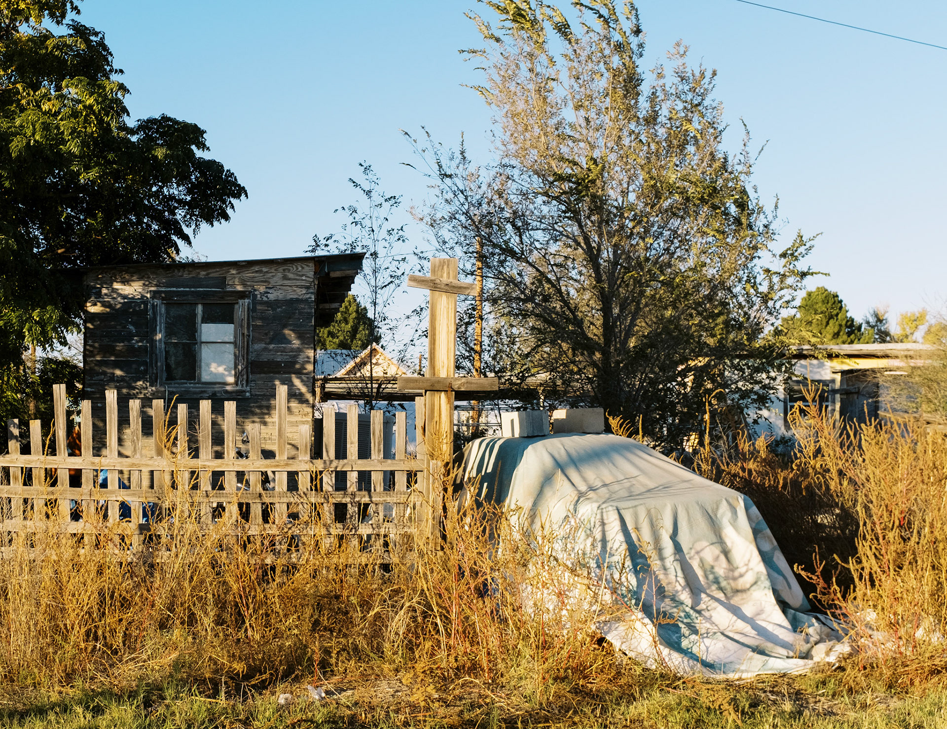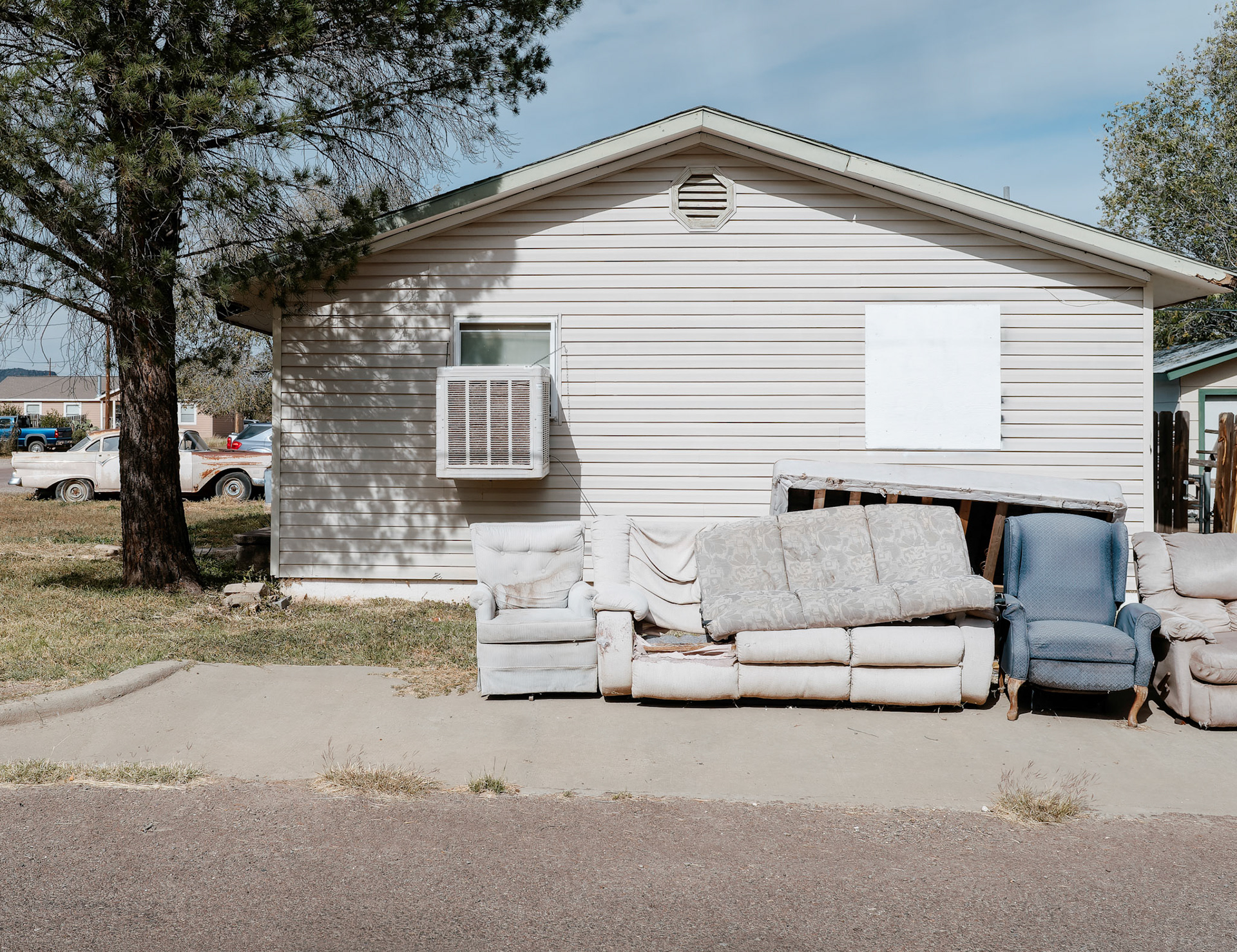 The Quiet Side is a photographic project developed on the margins of dominant narratives. It focuses on ordinary places - institutional buildings, houses, parking lots, motels, churches and parked RVs - observed from a distance, without direct human presence. The images depict spaces that are occupied, organized, sometimes abandoned, but always silent. Architecture becomes a language: façades, fences, tarps, numbers, flags - minimal signs of order and control. Nothing is spectacular. Everything remains in place. This work shows what persists once activity has withdrawn. The State, religion, domestic space, and intimacy continue to exist through their material forms, even when bodies have disappeared from the frame. The places seem to function on their own, sustained by a form of social and political inertia. The interiors - which appear sparingly - do not describe individual lives, but temporary uses: sleeping, waiting, passing through. The exterior spaces, meanwhile, form a geography of thresholds: gates, porches, passages, and intermediate zones where nothing is fully decided. Nature appears toward the end of the sequence, not as a refuge, but as a moment of breathing. Trees, wind, and birds introduce a suspension, a loosening of structure, without offering resolution. The Quiet Side does not document a specific territory. It observes a condition: that of a world that remains organized and maintained, sometimes fragile, where silence becomes an active form of presence.